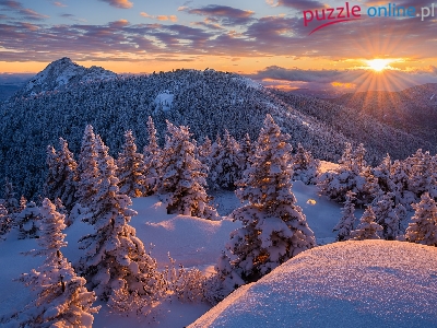 Ośnieżone, Wschód słońca, Zima, Zalesione, Drzewa, Góry