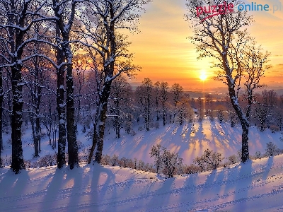 Puzzle Śnieg, Zima, Zachód słońca, Drzewa