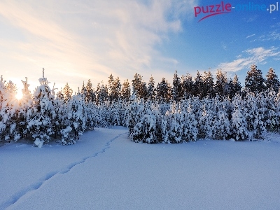 Puzzle Zima, Drzewa, Śnieg, Zachód Słońca