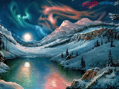 Puzzle Zima, Góry, Jezioro, Zorza Polarna