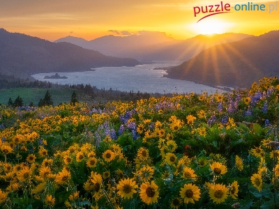 Góry, Waszyngton, Stany Zjednoczone, Rzeka, Promienie słońca, Łubin, Balsamorhiza, Columbia River Gorge, Kwiaty