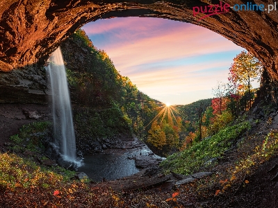 Promienie słońca, Jaskinia, Stan Nowy Jork, Stany Zjednoczone, Drzewa, Skała, Wodospad, Jesień, Las, Kaaterskill Falls