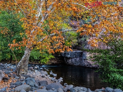 Rzeka, Drzewa, Jesień, Jawor, Grasshopper Point, Stan Arizona, Stany Zjednoczone, Kamienie, Sedona