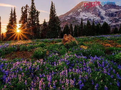 Kwiaty, Drzewa, Góra, Świerki, Łubin, Stan Waszyngton, Stany Zjednoczone, Łąka, Park Narodowy Mount Rainier