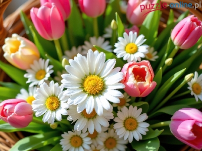 Kwiaty, Złocienie, Tulipany, Koszyk, Wiklinowy