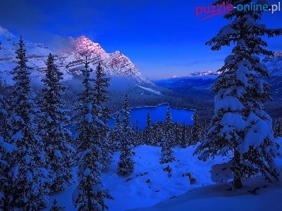 Jezioro Peyto, Zmierzch, Góry, Park Narodowy Banff, Zima, Kanada, Świerki, Drzewa