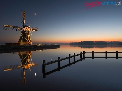 Puzzle Zmrok, Wiatrak, Rzeka, Holandia