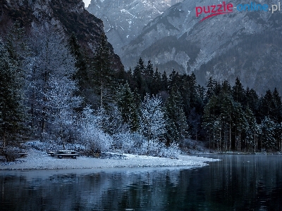 Puzzle Zmrok, Zima, Rzeka, Ławeczka
