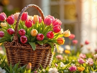Kwiaty, Żółte, Czerwone, Koszyk, Tulipany