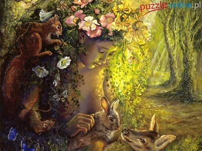 Zwierzęta, Las, Dziewczyna, Kwiaty, Magiczny
