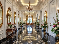 Żyrandol, Hol, Fotele, Stolik, Kinkiety, Wazony, Bukiety, Lustra, Kwiaty, Kolorowe